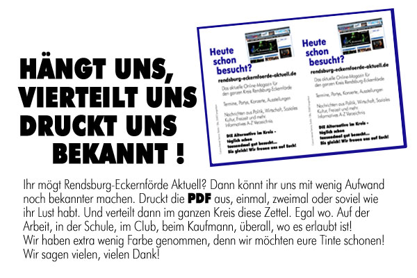 (CIS-intern) – Sechs Monate Rendsburg-Eckernförde Aktuell. Sechs Monate das erste „echte“ uns bekannte alternative Online-Portal für diesen Kreis im Netz. Denn uns gibt es „nur“ online. Alle anderen Angebote kennt ihr als Online-Präsenzen diverser Zeitungen, Zeitschriften oder Veranstaltungsmagazine. Um so schwieriger ist es allerdings auch, bekannt zu werden.
